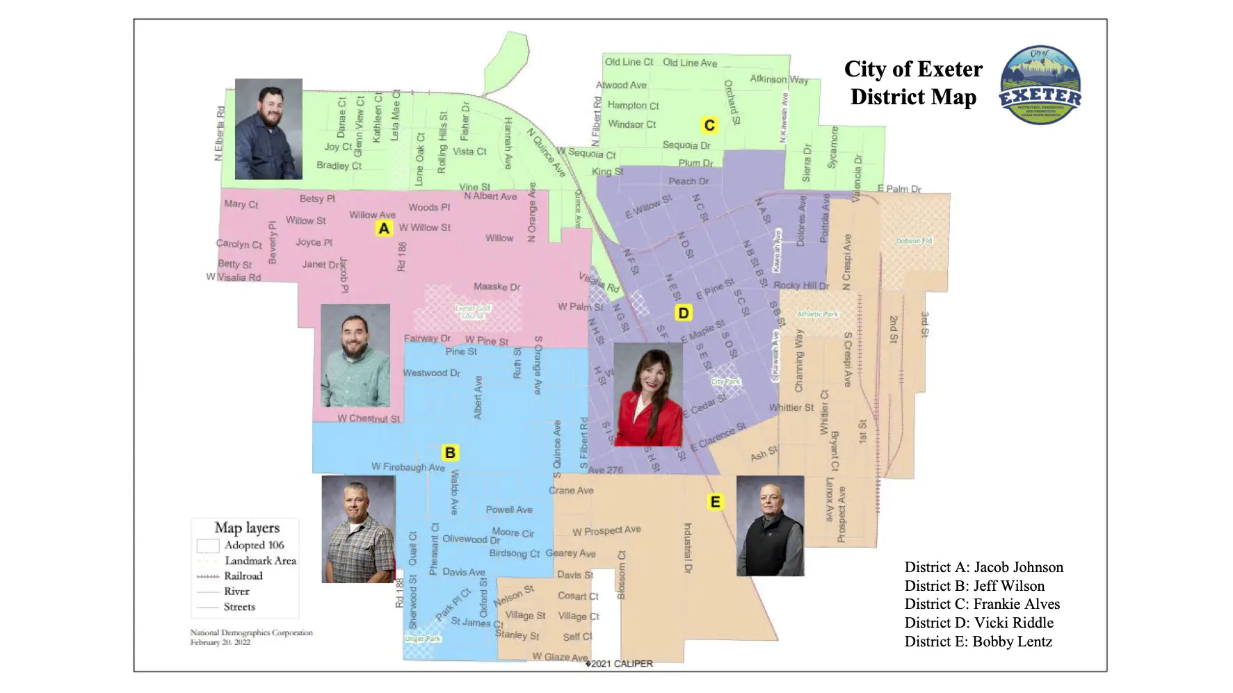 The Exeter City Council District Map was recently updated as required every ten (10) years. The most recent Exeter City Council District Map approved in 2022 can be found below: