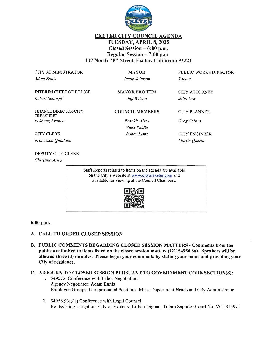 April 8, 2025 Regular Meeting of the Exeter City Council Agenda Apr 4, 2025 Download File Type: pdf Categories: Reports Archives