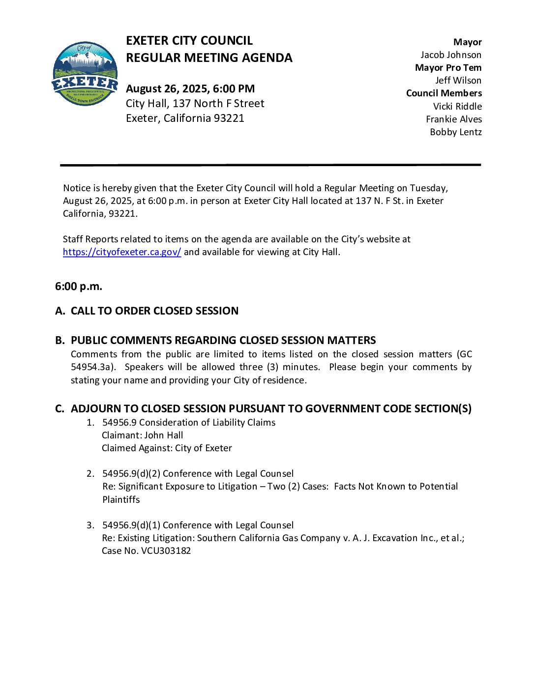 August 26, 2025 Regular Meeting of the Exeter City Council Agenda Packet Aug 22, 2025 Download File Type: pdf Categories: Reports Archives