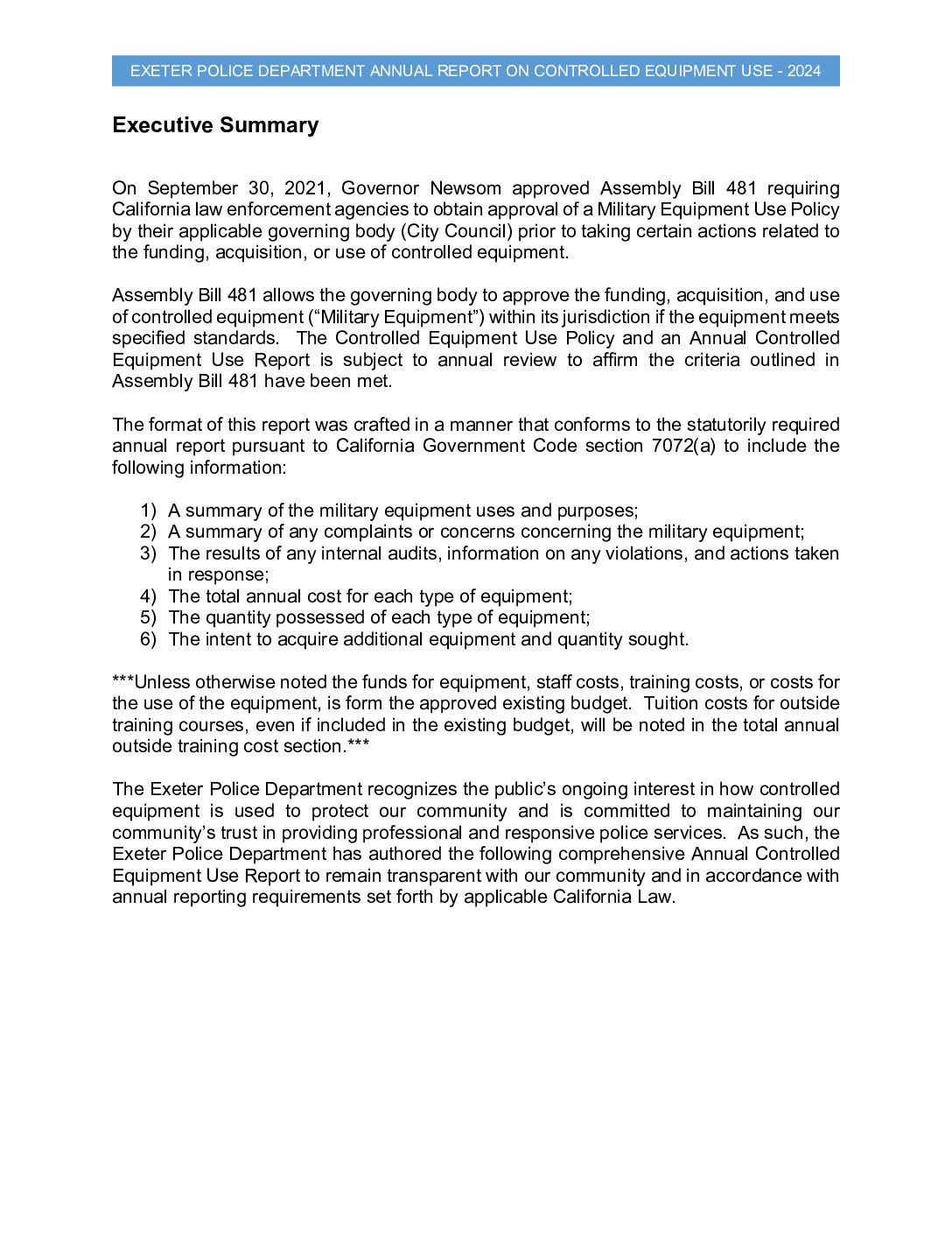 This report outlines the Exeter Police Department’s use, oversight, and planned acquisition of controlled equipment as defined under California Assembly Bill 481. It includes detailed summaries of equipment categories, usage data, audit results, and community transparency efforts for the 2024 calendar year. The document affirms the department’s commitment to public safety, accountability, and compliance with state law.